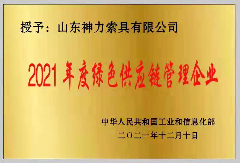 山東神力索具有限公司榜上有名,榮獲“2021年度綠色供應鏈管理企業(yè)”稱號。綠色供應鏈管理企業(yè)申報范圍涵蓋汽車、航空航天、船舶、電子電器、通信、電力裝備、大型成套裝備機械、輕工、紡織、食品、醫(yī)藥、建材、電子商務、快遞包裝等行業(yè)中代表性強、影響力大、經營實力雄厚、綠色供應鏈管理基礎好的核心企業(yè)。