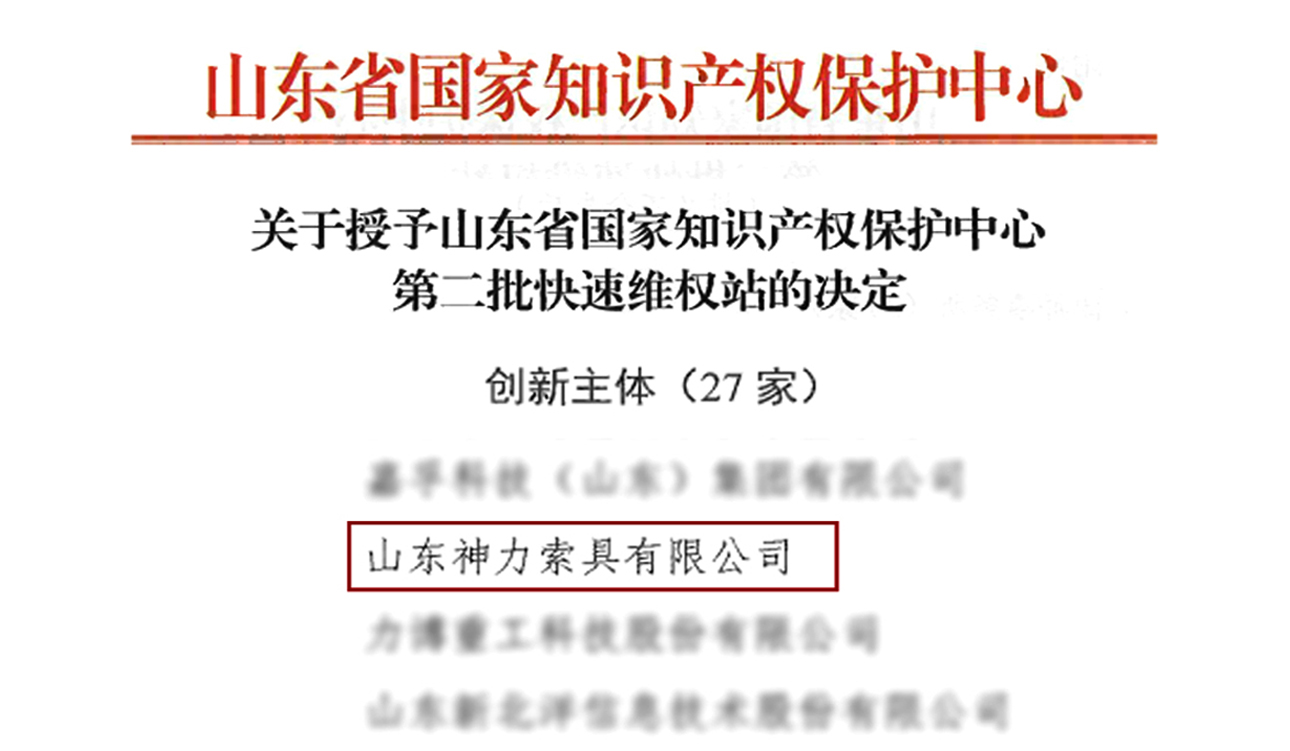 神力索具作為在山東省國家知識產權保護中心備案的快速審查企業、首批“專精特新”小巨人企業,依托創新優勢、科技產業優勢,積極參與,勇于擔當,助力知識產權強省建設。經過逐級申報、初步審核、公開公示,神力索具被山東省國家知識產權保護中心授予“山東省國家知識產權保護中心快速維權站”,成為山東省第二批獲批的快速維權站創新主體。