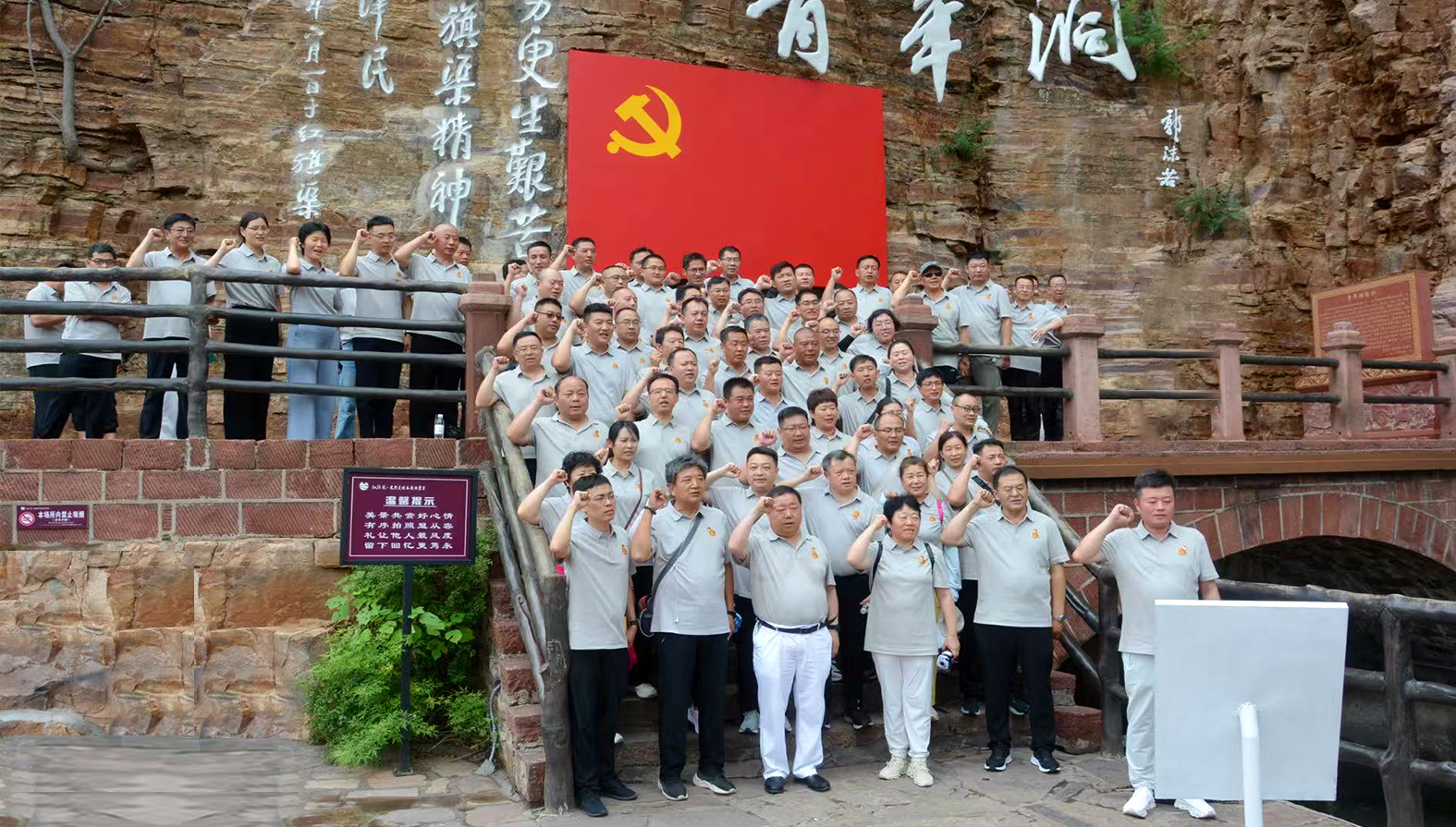 在紅旗渠咽喉工程——青年洞前,神力索具全體黨員在董事長兼總經理杜大平的帶領下,莊嚴舉起右拳,重溫入黨誓詞。“我志愿加入中國共產黨,擁護黨的綱領,遵守黨的章程……”鏗鏘誓言在峽谷間回響,激蕩著每一位黨員的心靈。