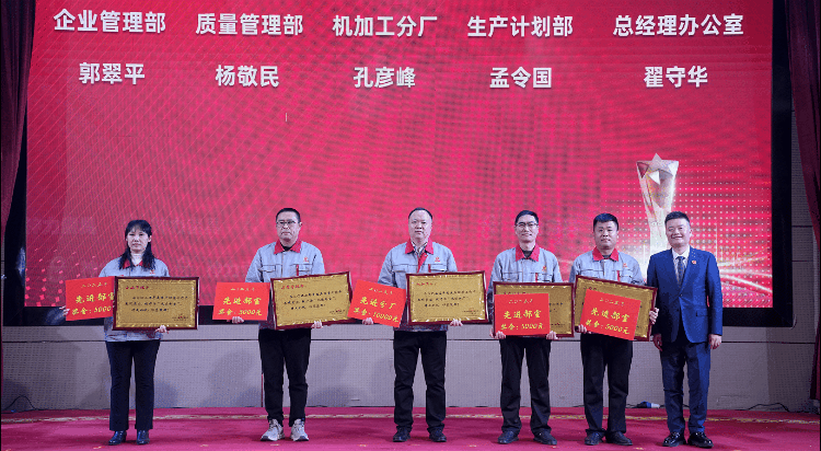 先進集體和先進個人代表依次上臺發言。其中機加工分廠孔彥峰(先進分廠代表),生產計劃部孟令國、質量管理部代繼強(先進部室代表),鍛造分廠謝昌軍、機加工分廠李洪安(先進班組代表)等來自各條戰線的優秀代表,結合自身崗位分享了奮斗心得。